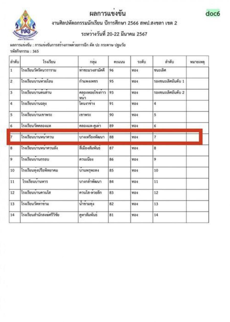การแข่งขันศิลปหัตถกรรมนักเรียนครั้งที่ 71 ระดับชาติ ระหว่างวันที่ 20-22 มีนาคม 67 ผลการแข่งวันที่ 20 มีนาคม. 67 รร.บ้านหน้าควน เครือข่ายบางเหรียงพัฒนา เข้าร่วมกิจกรรม 4 รายการ ได้รับรางวัล (เหรียญทอง 3 รายการ เเละเหรียญทองแดง 1 รายการ) S:0